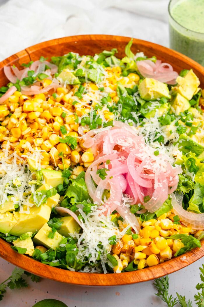 Step 5: In a large bowl, combine the lettuce, avocado, chives, grilled corn, and pickled onions. Drizzle the dressing over the salad just before serving.