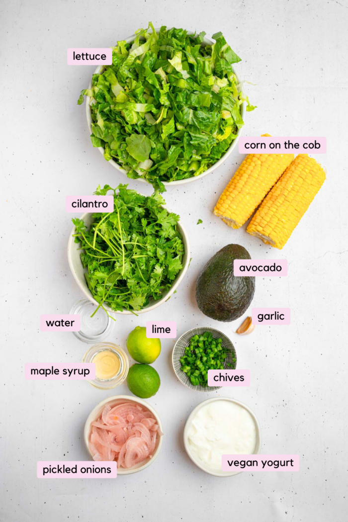 This avocado and corn salad is like summer in a bowl. Sweet grilled corn, creamy avocado, crisp lettuce, and tangy pickled onions, finished with a zesty vegan cilantro-lime yogurt dressing… Does it get better than this?