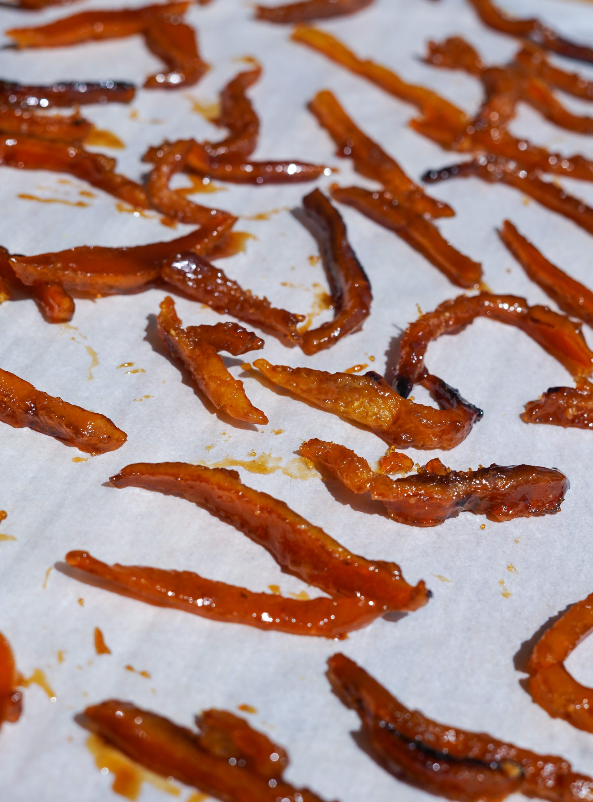 Transfer the peels to a parchment paper-lined baking sheet, and allow to cool for 4 hours. You can store the candied citrus peel for up to a month in a cool, dry place on your countertop.
