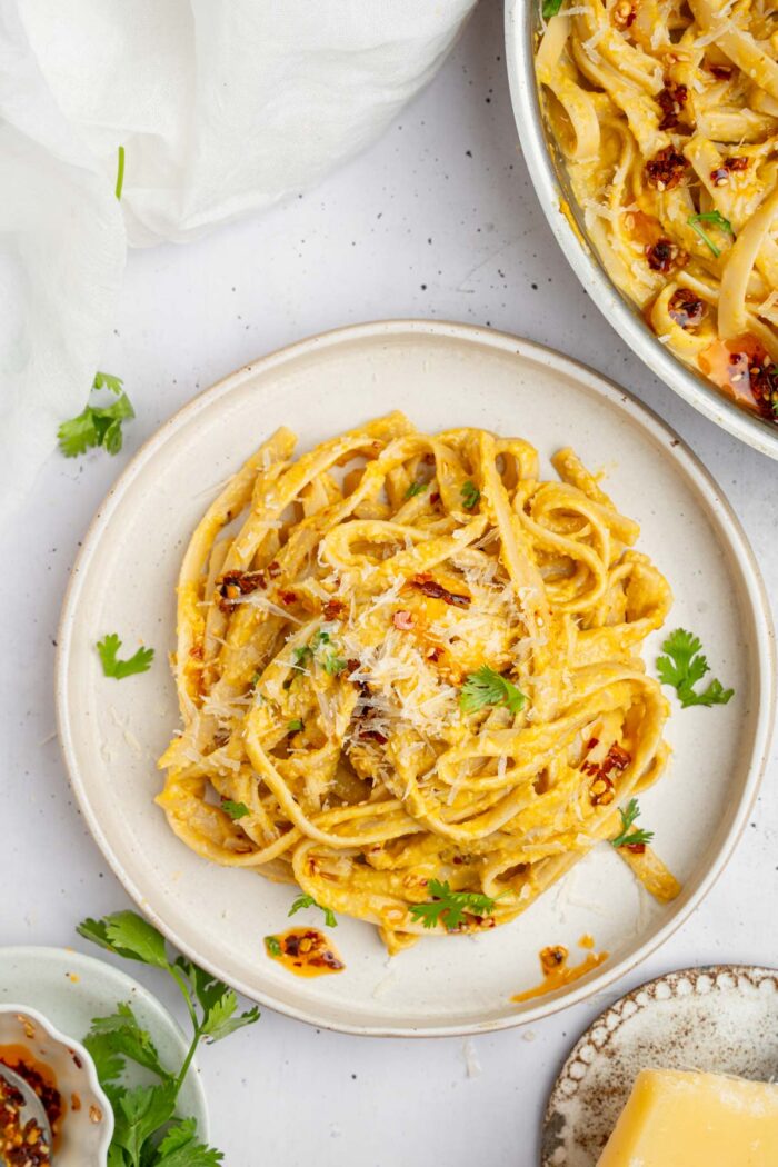 Step 8: Drain the pasta and return it to the pan over low heat. Pour in the creamy corn sauce and stir to coat. Stir in the chili crisp, vegan parmesan and nutritional yeast if using. Enjoy with fresh parsley!