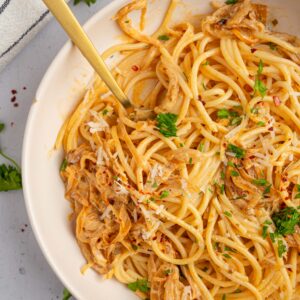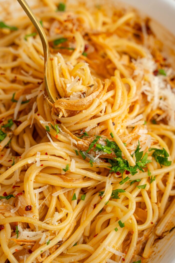 - When the onions are caramelized, remove the head of garlic, and squeeze the cloves in. Add the cooked spaghetti and reserved pasta water if needed and stir until the pasta is coated with the onions and the sauce. Finish with a generous serving of fresh parsley, red chili flakes and vegan parmesan. Serve immediately.
