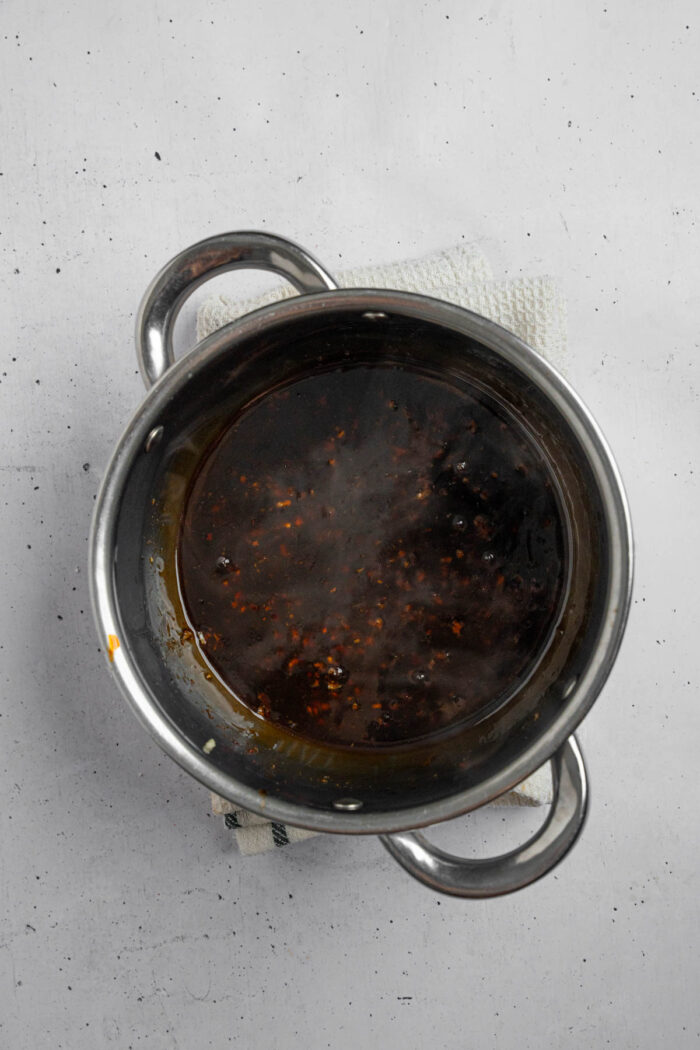 - While that simmers, in a small bowl, add the cornstarch and water to create a slurry. Add the slurry to the sauce and stir until it thickens, like honey or maple syrup consistency.
