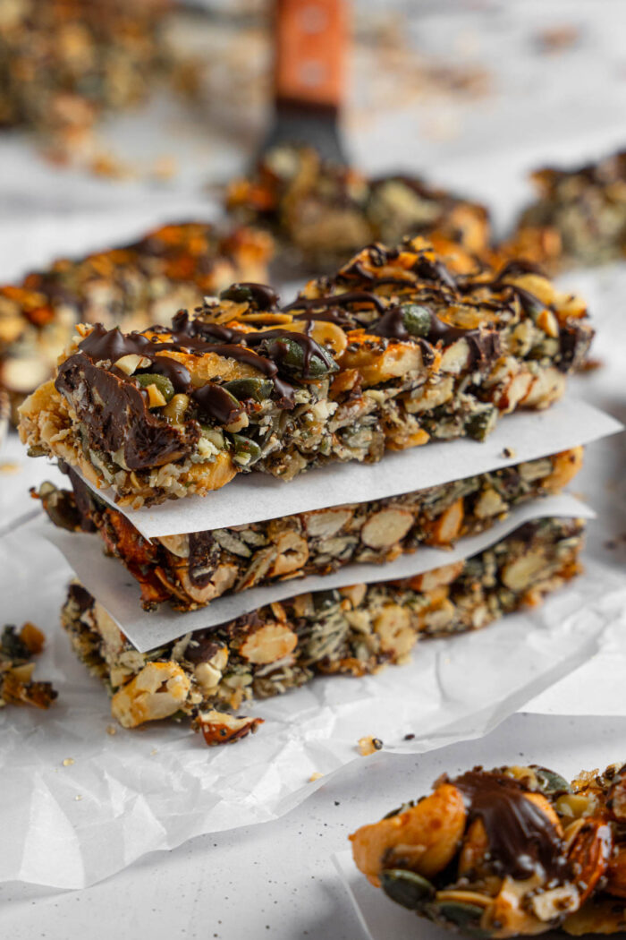 These crunchy nut and seed energy bars are packed with nutrients and just sweet enough to feel like a treat. Perfect as an afternoon snack or workout fuel.