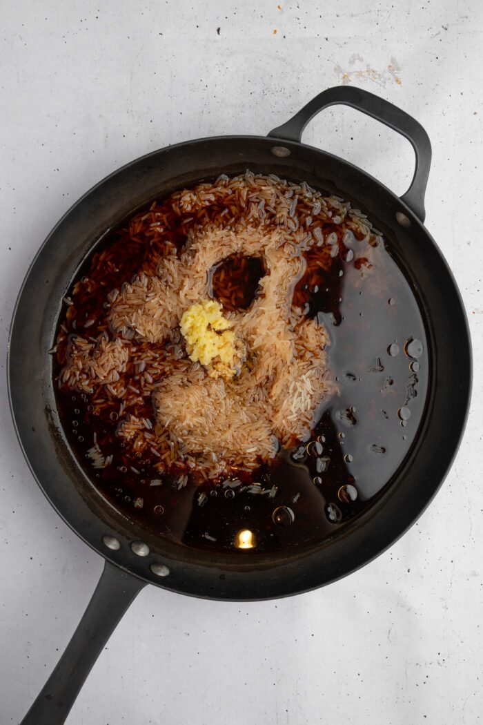 - Add the rice to a medium pot along with the water and all of the sauce ingredients. Stir well to combine.