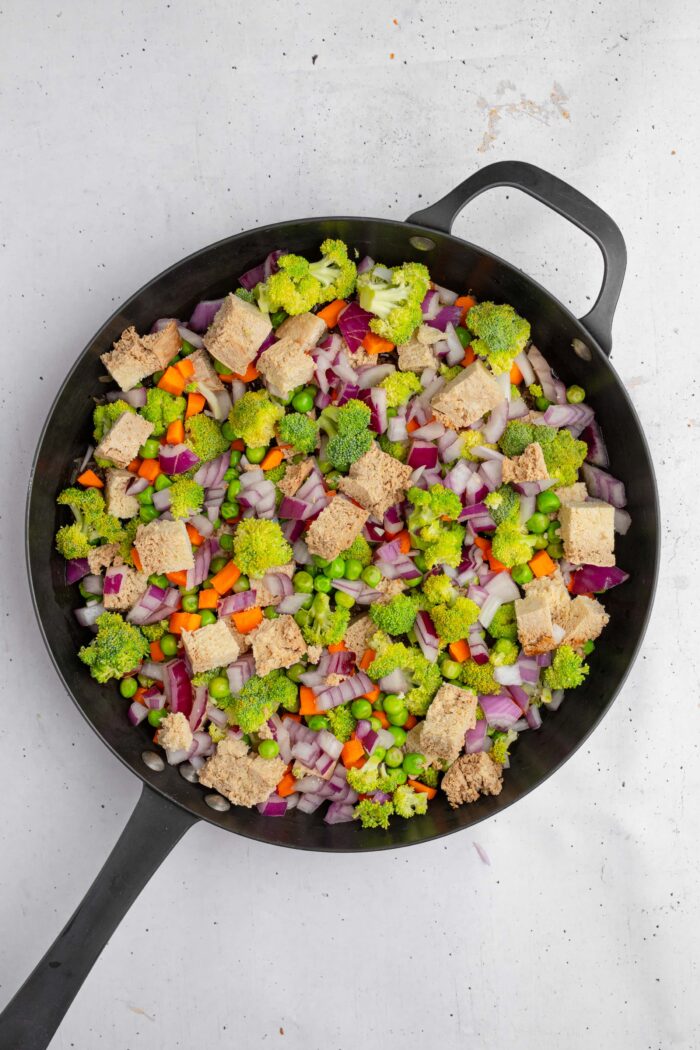 Step 2: Layer the frozen carrot and pea mix, red onion, broccoli, and cubed smoked tofu directly on top of the rice mixture. Do not stir at this point. Keeping everything layered helps the rice cook properly underneath.