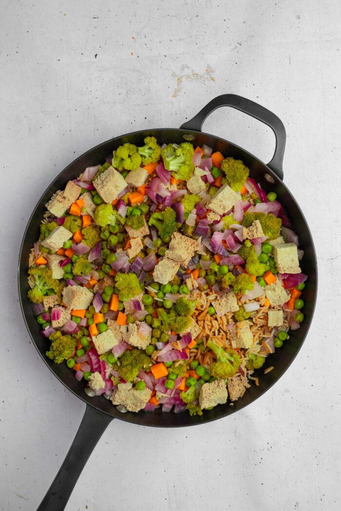 - Layer the frozen carrot and pea mix, red onion, broccoli, and cubed smoked tofu directly on top of the rice mixture. Do not stir at this point. Keeping everything layered helps the rice cook properly underneath.