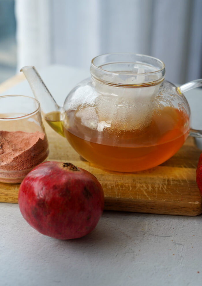 - How do I make pomegranate tea from pomegranate powder? Steep 1 tsp of the powder in warm water, then strain for a pomegranate peel tea.