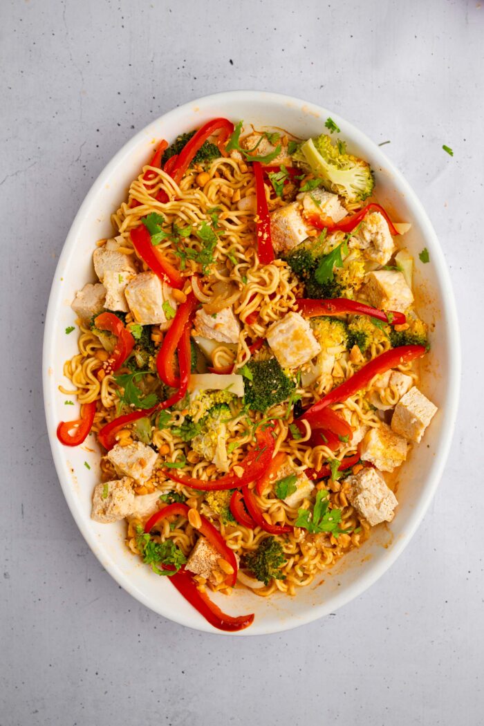 - Next, add the ramen noodles, making sure they are submerged. Add broccoli, bell pepper and onion. Place the tofu on top so it gets browned in the oven.