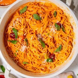 Many traditional pasta sauces are inspired by the colors of the Italian flag: red, white, and green. And while tomato is an obvious choice, today we will highlight red bell pepper to create a creamy pasta sauce with a red-orange hue.
