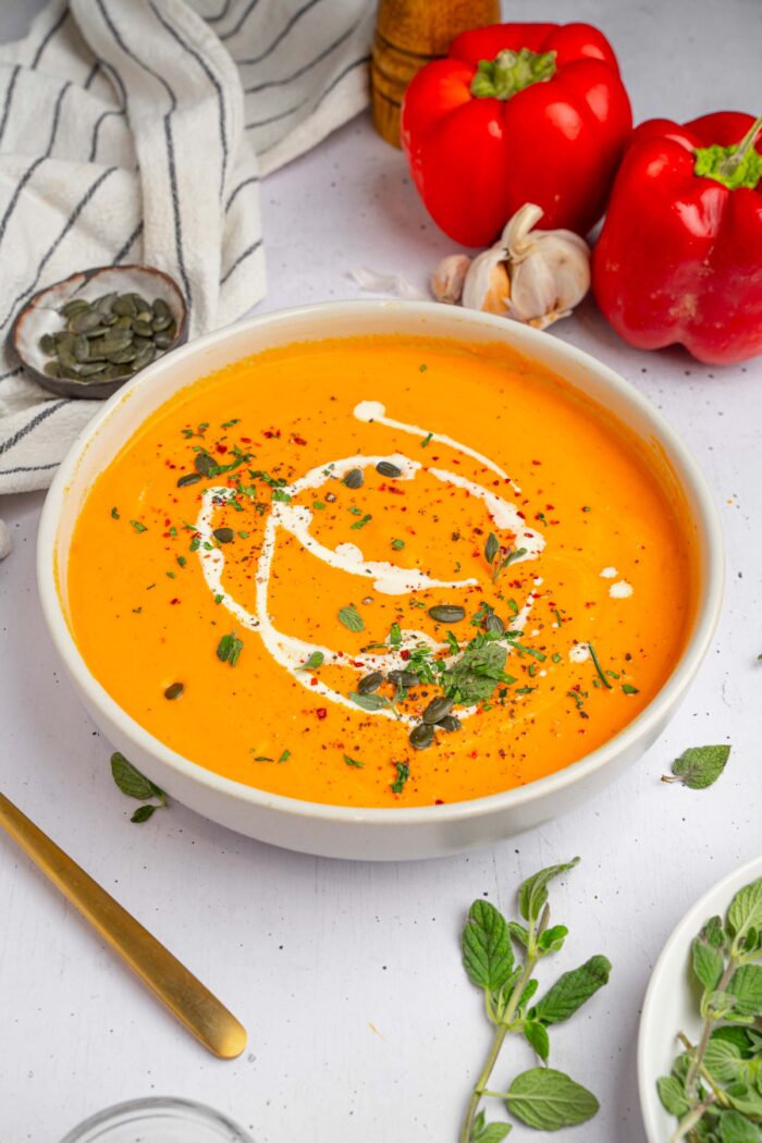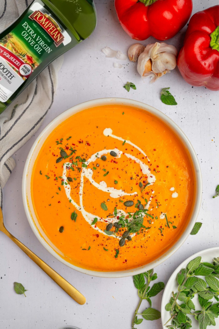 - Red peppers turn sweet and smoky once roasted. They’re the beautiful base of the soup.