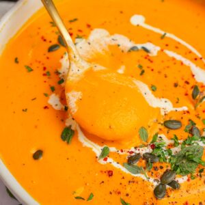 This creamy, vibrant roasted red pepper carrot soup is beautiful as it is delicious. Red peppers, carrots, and tomatoes are blended with herbs and coconut milk for a silky, comforting bowl perfect for chilly days.