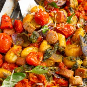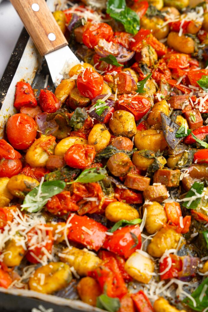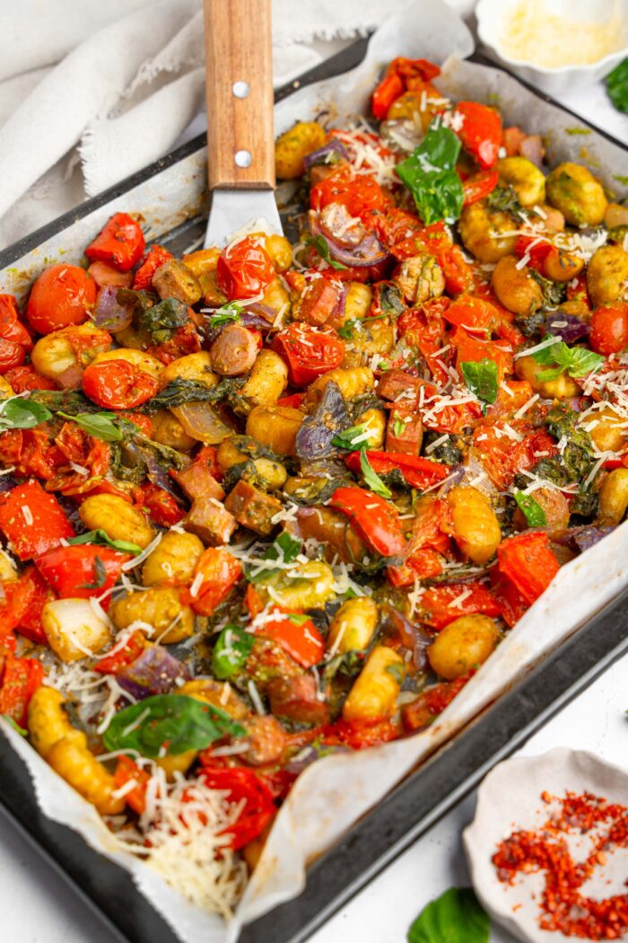 - Sprinkle this sheet pan gnocchi with sausage and pesto with vegan parmesan or nutritional yeast for a cheesy finish.