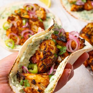Finally, make the tacos. Grill or warm up the tortillas, spread some avocado crema on top, and add the spicy cauliflower. Finish your spicy cauliflower tacos with toppings of choice, such as pickled onions, fresh cilantro, jalapeños, or salsa. Enjoy immediately.