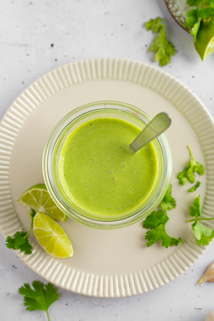 This fresh, zesty vegan cilantro lime dressing is perfect for salads, tacos, or grain bowls! What an easy way to add a splash of green to any meal.