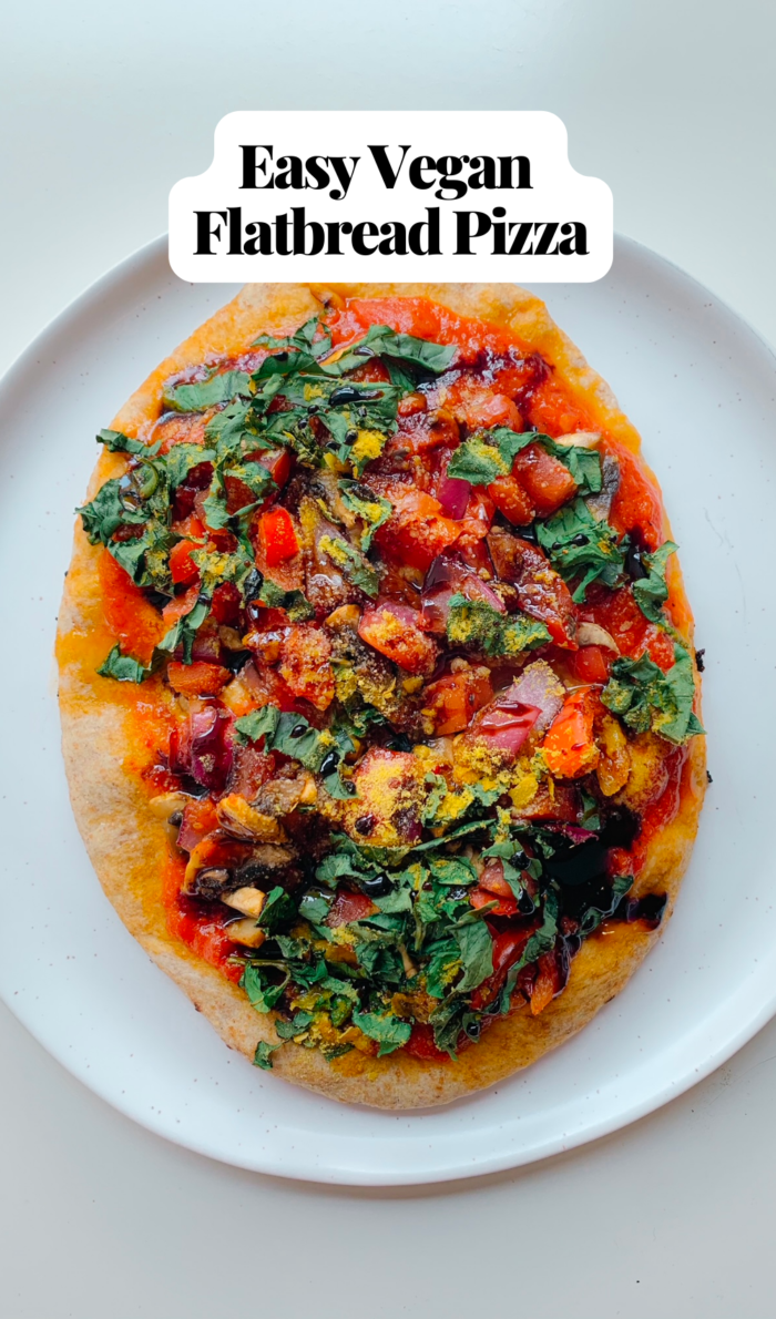 This easy 15-minute vegan flatbread pizza is a delicious and quick whole-food, plant-based meal that will satisfy all your pizza cravings!
